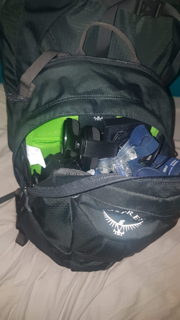 My biggest challenge was my CPAP. I’ve been worrying about it the last few days, thinking perhaps somehow I’d have to carry it separately in it’s carrying case. Traveling in Canada and the US has posed no problems as due to non-discrimination laws medical devices don’t count as a carry-on item. However, internationally, many countries and their airlines don’t have such policies. I would hate to show up for my flight and have to deal with explanations. Suffice to say though, the day pack managed to handle it with a bit of careful execution. The CPAP itself took up about 60% of the space while all my other electronics and gear took up the rest of the real estate. The pictured wireless headphones are just a placeholder as I’m getting some noise cancelling headphones. The rest of my gear is: Surface Pro w/ Bluetooth mouse and charger, Kindle Paperwhite, charger for my Samsung Gear S3 smartwatch, a couple of USB cables, a universal adapter, duct tape, and my Canon 6D w/ 40mm lens and charger. To the left, as mentioned, is the CPAP (Airsense 10) w/ hose and nose piece, along with the 98W battery pack (good for 16 hours), and charging cables.